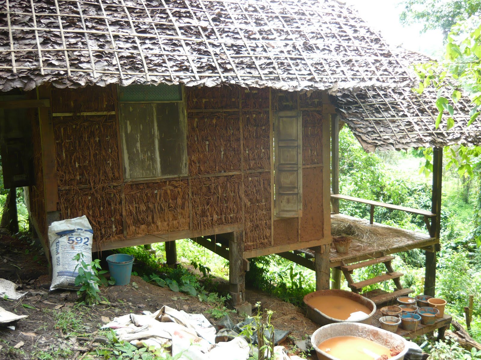 My warmshower host Jew whom I contacted since I arrived in Chiang Mai has confirmed yesterday that she will pick me up today at the Thapae Gate 11 am. Initially I wanted to ride up and meet her somewhere near her house, as we both can communicate thru' our mobile phones, but she insisted that I follow her car since she also wanted to send her brother to the city anyway.So, to my friends back home, don't cry foul on me for not cycling! Jew rang me up at 10.15 am while I still busy packing up in my room, when I am riding on my way, I heard someone calling "MENG", I stop and turn my head, I saw Jew walking towards me, and soon we were on our way for two hours of driving in her Mitsubishi 4x4 pick up. Her house is in Maesae,100km north of Chiang Mai. Route 107 is flat until Mae Taeng and then a left turn into a smaller scenic route 1095, but more winding and hilly. Inside the car, we got to know each other better, Jew and her husband travelled broadly, she was ex-stewardess of Gulf and Thai Airlines, the reason for her good speaking English, which is very lacking in many Thais I met. She also backpacked a lots with her husband like Tibet and India, but unfortunately I did not get the chance to meet her husband in person, due to his engineering work in China. They both love the mountain jungle life style and running away from the city life. In a piece of land with a small stream, they designed and built a few small bamboo clay huts to host guests and tour cyclists that shared the same dream in the quiet jungle life.According to Jew, I had the honour for being the first tour cyclist to share their dream! Jew had prepared personally a fried noodle, a pot of Italy black coffee, a bowl of vegetable salad and bumpkin soup, so kind of her !!!.Jew is a vegetarian and she hired a Myanmar worker Paul who had nothing better to do after dinner, with a puzzle consists of 15 sticks and formed into a buffalo,by moving two of them to form 2 buffaloes. I am still cracking my head on how to do it, can someone smart enough to help me? Hope to see the answer soon.